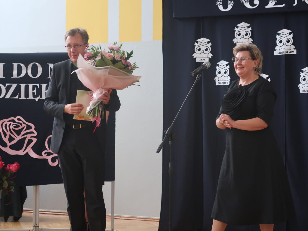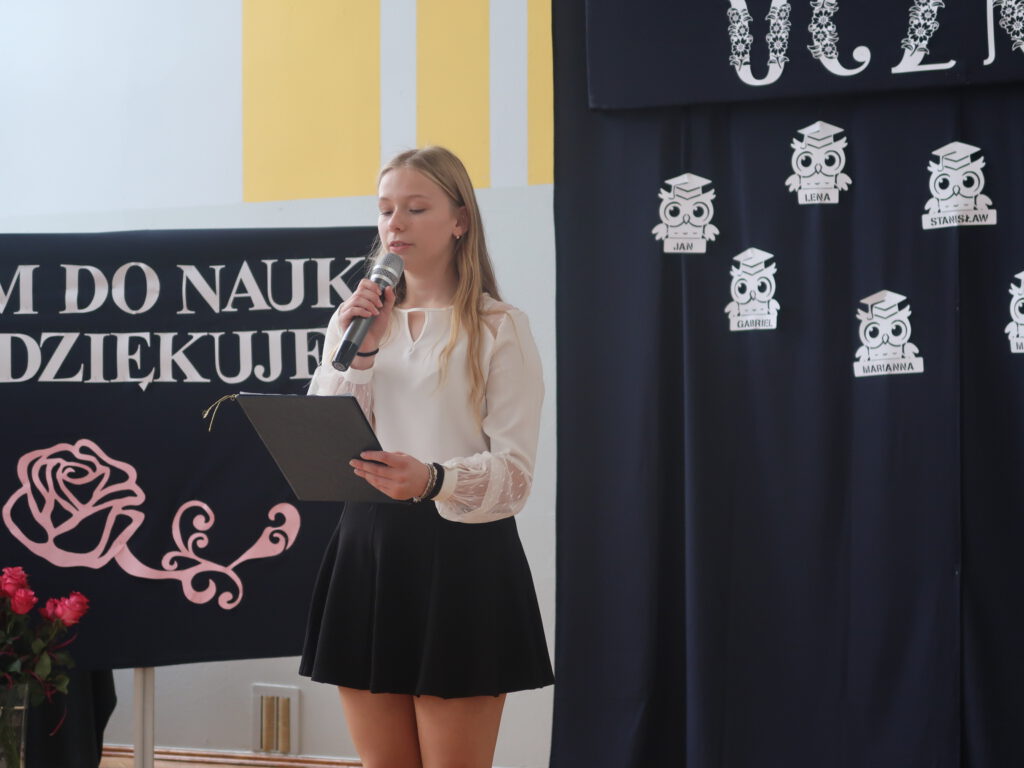Dzień Edukacji Narodowej to również święto nauczycieli i pracowników szkoły. Nie zabrakło życzeń i serdeczności. Zostały wręczone Nagrody Dyrektora dla nauczycieli za wyjątkowe osiągnięcia dydaktyczne i wychowawcze oraz szczególne podziękowania dla Przyjaciela Szkoły, który finansowo wspiera szkolne przedsięwzięcia. Naszą uroczystość zaszczycili obecnością – Zastępca Wójta gminy Aleksandrów Kujawski, Przewodniczący Komisji Kultury, Oświaty, Opieki Społecznej i Spraw Socjalnych oraz radny Gminy Aleksandrów Kujawski. Życzenia złożyła również przewodnicząca Samorządu Uczniowskiego, a całość wydarzenia została zwieńczona występem wokalnym z piosenką ,,Radość najpiękniejszych lat”.