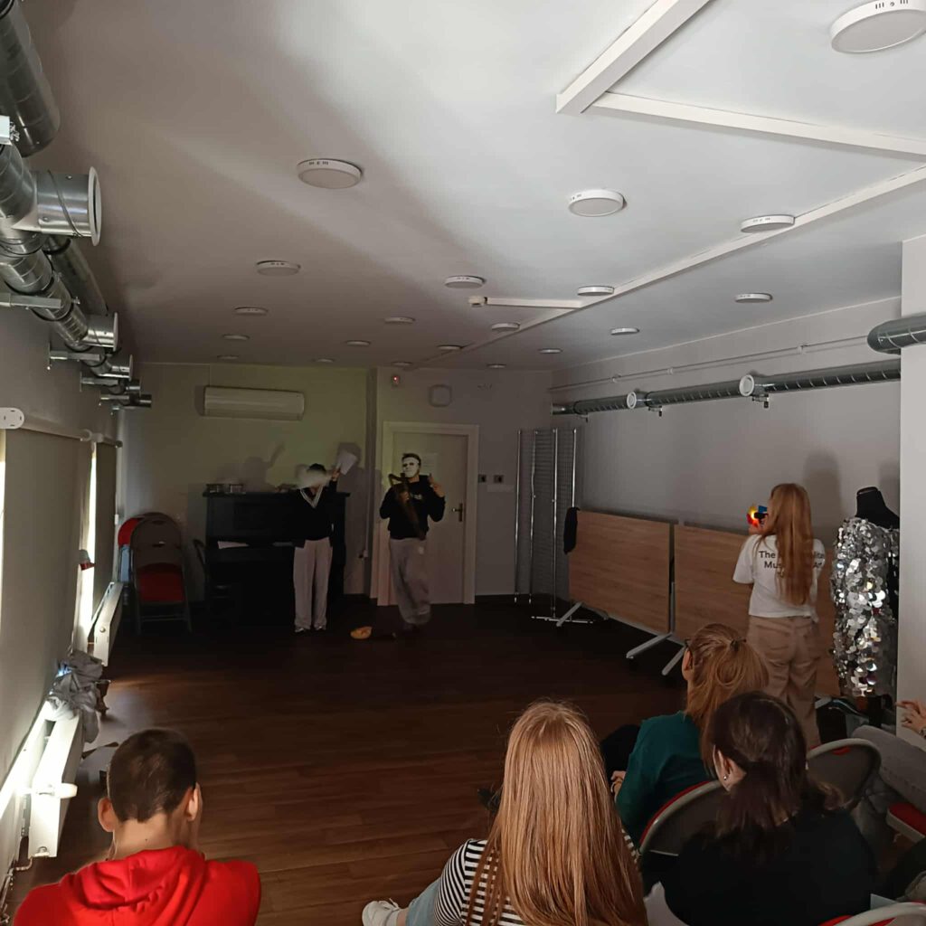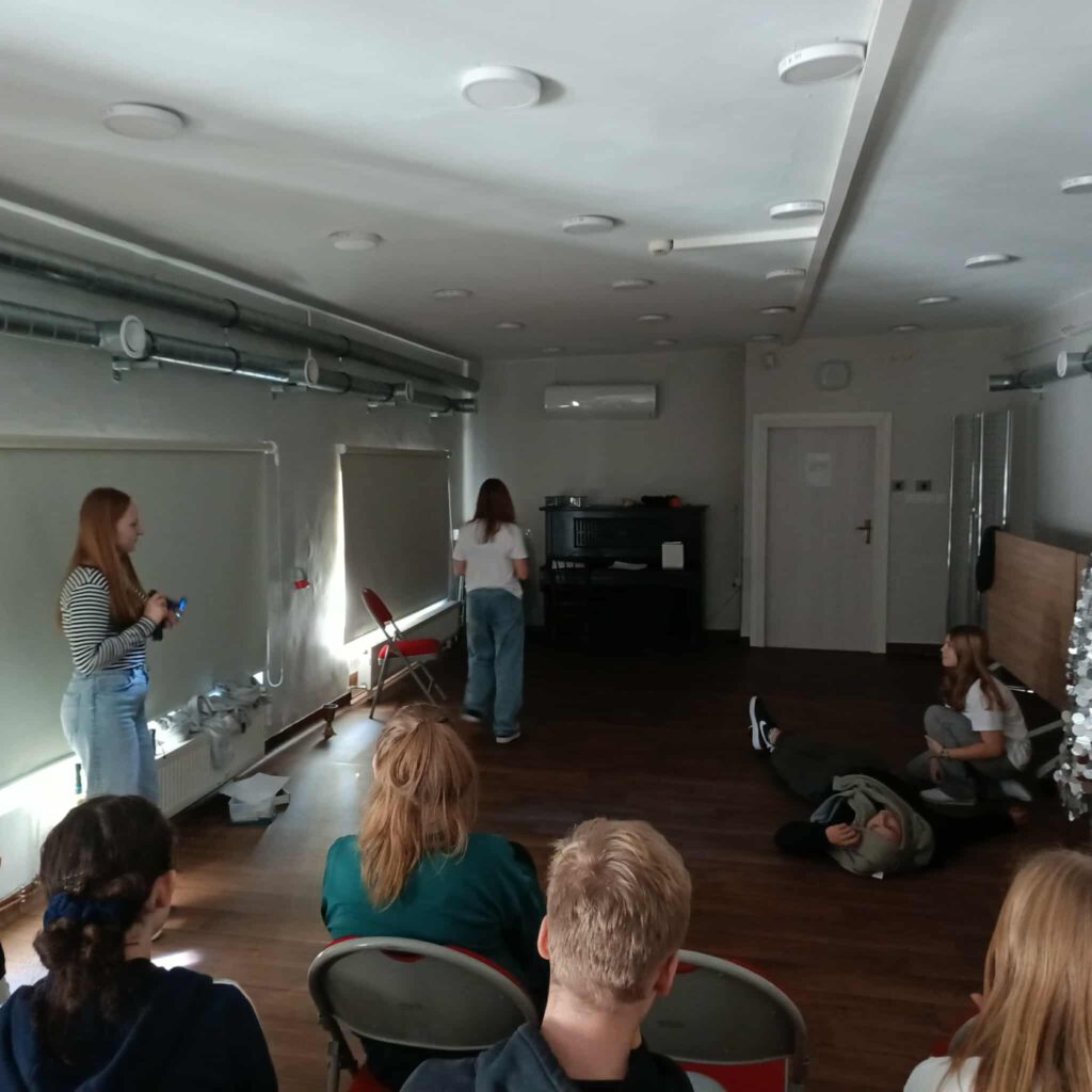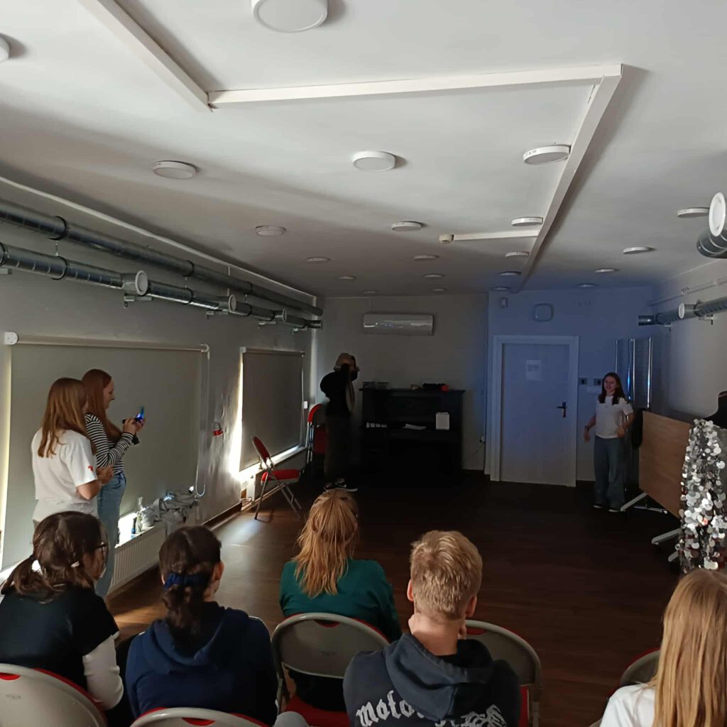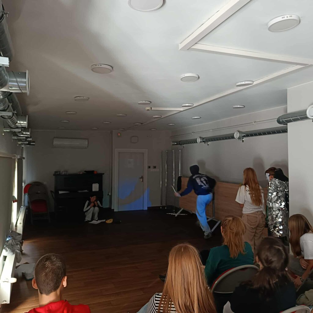 Następnie uczniowie odwiedzili Teatr im. Wilama Horzycy, gdzie poznali jego ponad stuletnią historię dzięki pani Marcie Wudarskiej. Następnie wzięli udział w warsztatach teatralnych prowadzonych przez pedagożkę teatru Joannę Stoike. Była rozgrzewka aktorska, ćwiczenia ruchowe, budowanie „maszyn z ciał” (zwierciadła marzeń i maszyny emocji) oraz improwizowane spektakle!