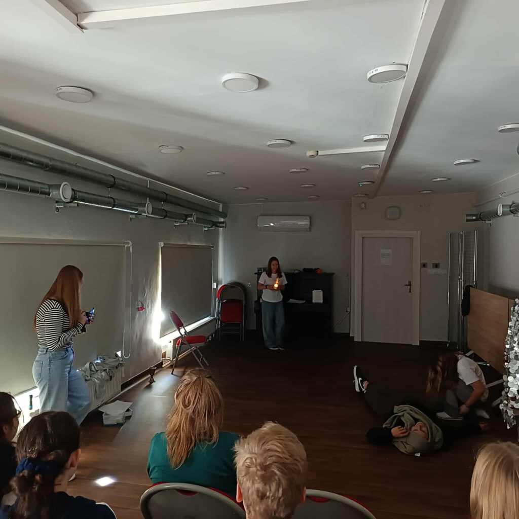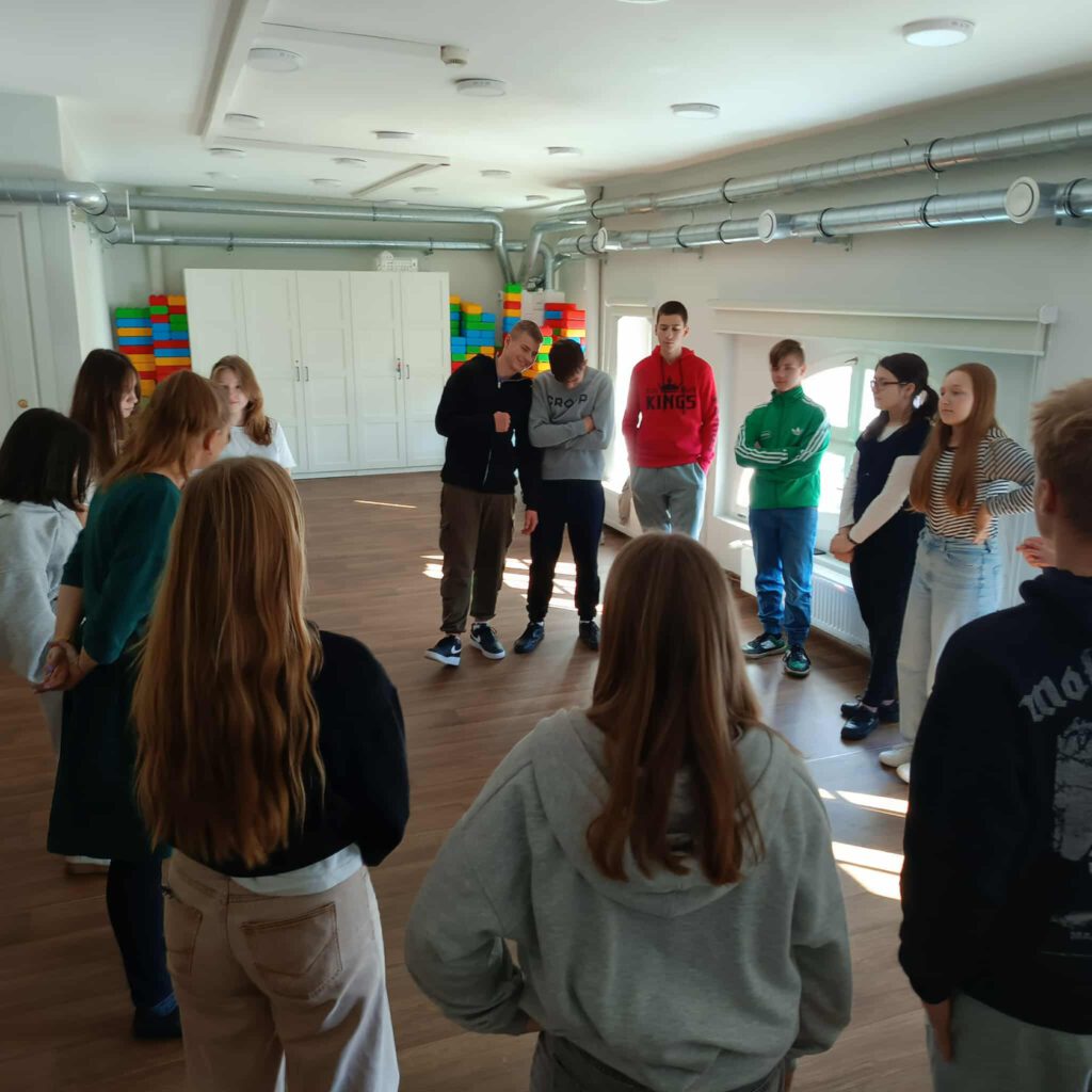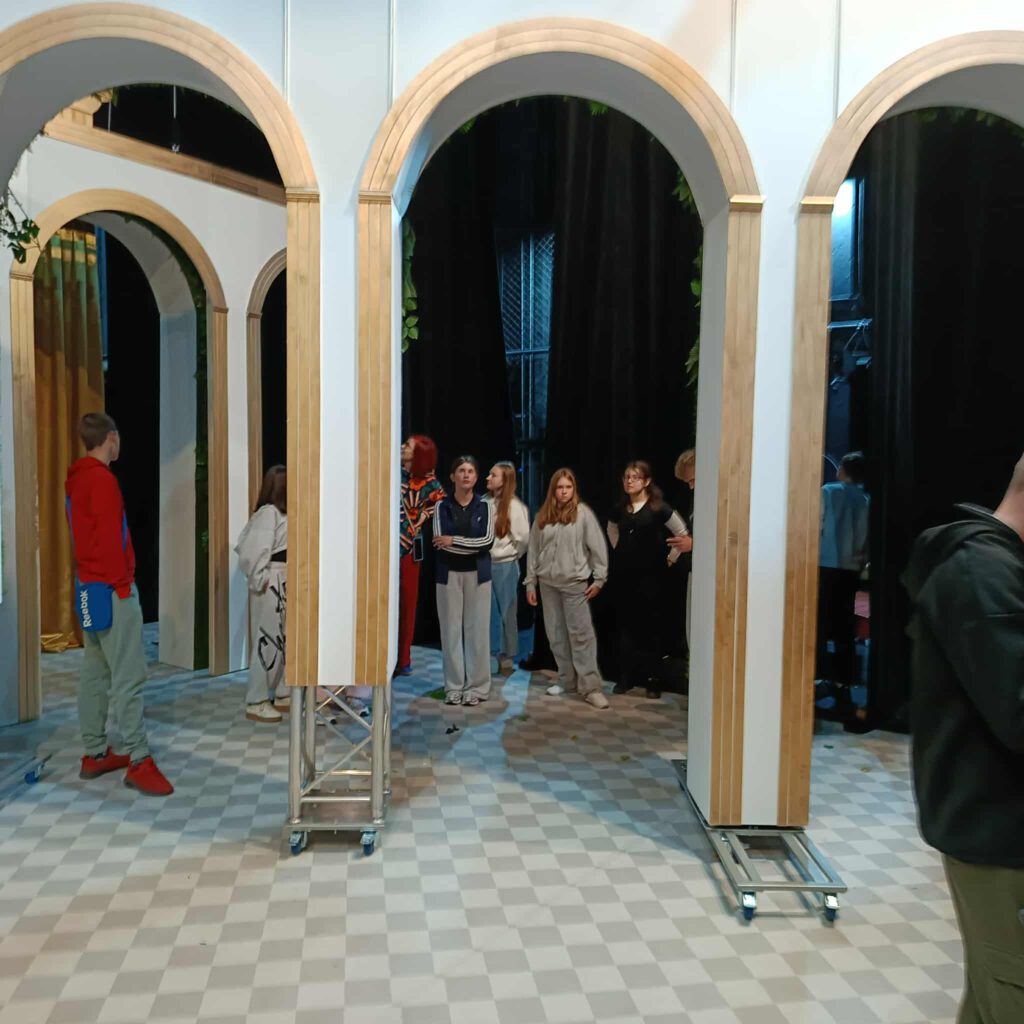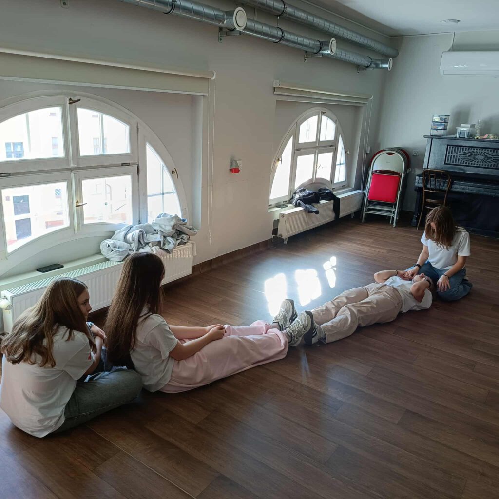 Następnie uczniowie odwiedzili Teatr im. Wilama Horzycy, gdzie poznali jego ponad stuletnią historię dzięki pani Marcie Wudarskiej. Następnie wzięli udział w warsztatach teatralnych prowadzonych przez pedagożkę teatru Joannę Stoike. Była rozgrzewka aktorska, ćwiczenia ruchowe, budowanie „maszyn z ciał” (zwierciadła marzeń i maszyny emocji) oraz improwizowane spektakle!