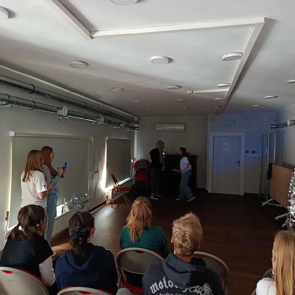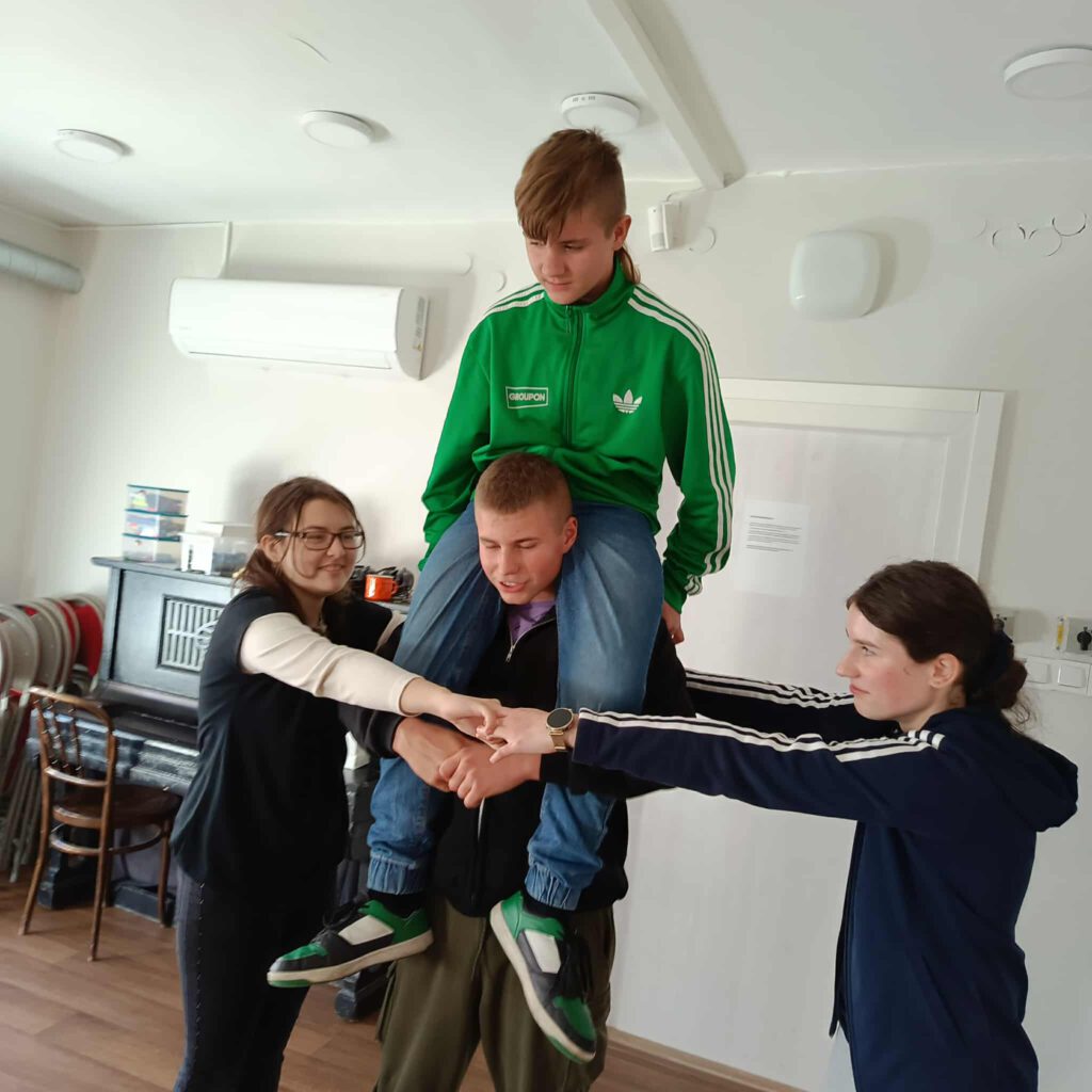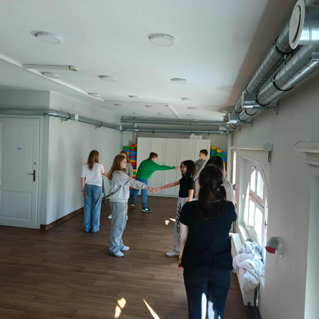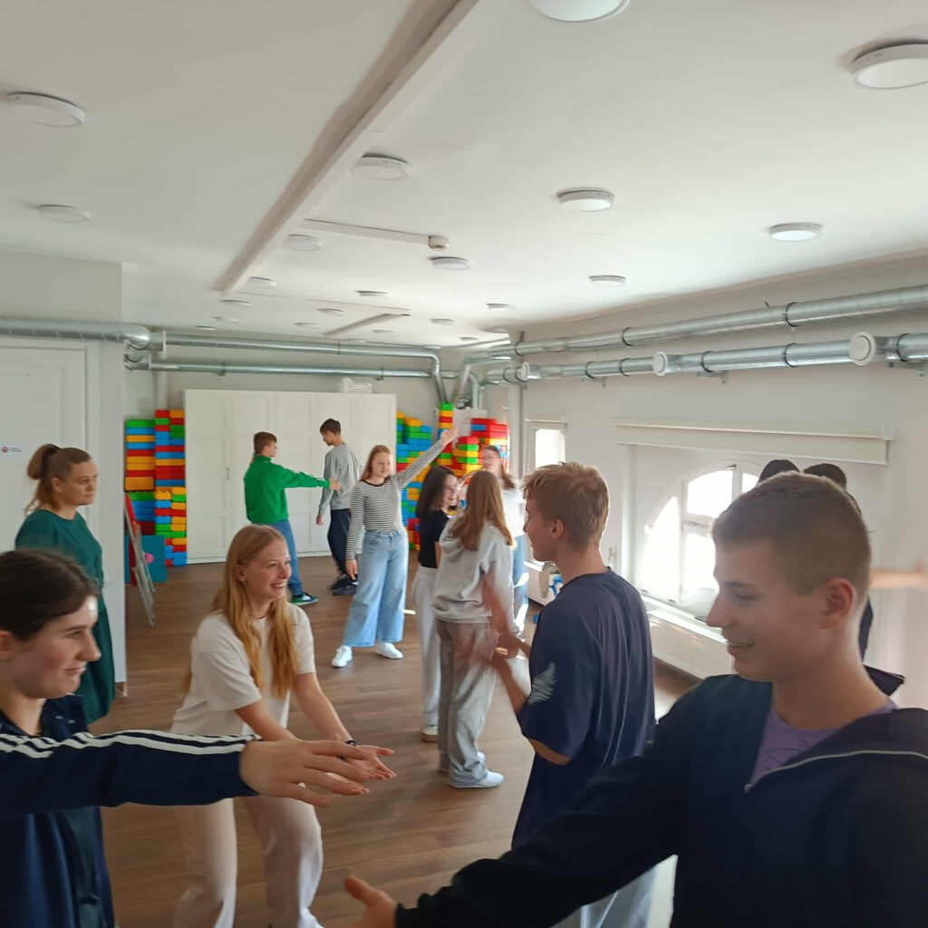 Następnie uczniowie odwiedzili Teatr im. Wilama Horzycy, gdzie poznali jego ponad stuletnią historię dzięki pani Marcie Wudarskiej. Następnie wzięli udział w warsztatach teatralnych prowadzonych przez pedagożkę teatru Joannę Stoike. Była rozgrzewka aktorska, ćwiczenia ruchowe, budowanie „maszyn z ciał” (zwierciadła marzeń i maszyny emocji) oraz improwizowane spektakle!