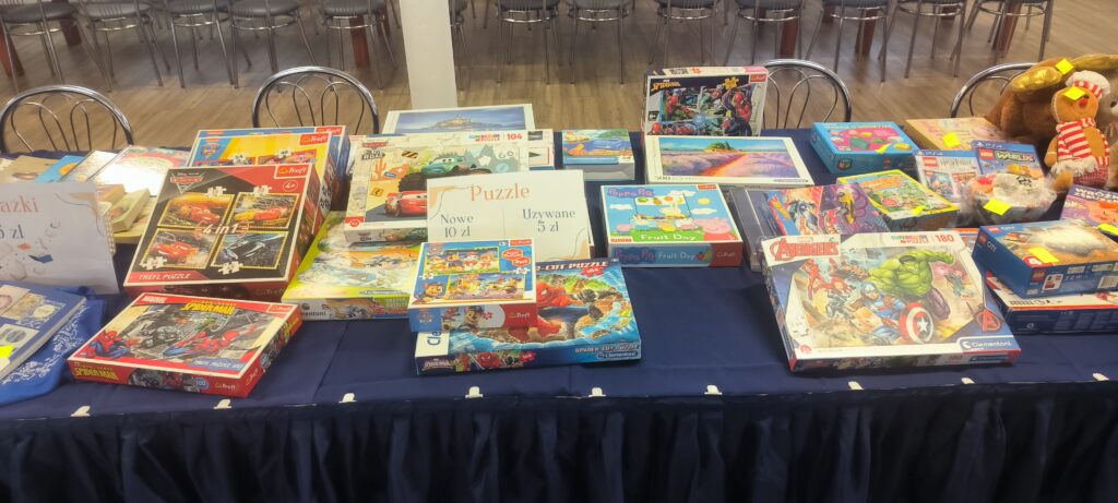 Dziękujemy naszym wspaniałym wolontariuszom, którzy przez cały czas z zaangażowaniem obsługiwali stoiska, pomogli w przygotowaniach i organizacji. Dziękujemy Radzie Rodziców za przepyszne wypieki i przekazane dary, a także za rękodzieło – makramy, malowane kamienie. Dziękujemy uczniom klas VI i VII za przygotowane stroiki świąteczne oraz wszystkich uczniom, którzy podzielili się grami, książkami, ręcznie robioną biżuterią. Szczególne podziękowania kierujemy do Pani Iwony Janowczyk z Piekarni ADIX, która wyposażyła nasze stoiska w fantastyczne słodkości w naprawdę imponującej ilości.