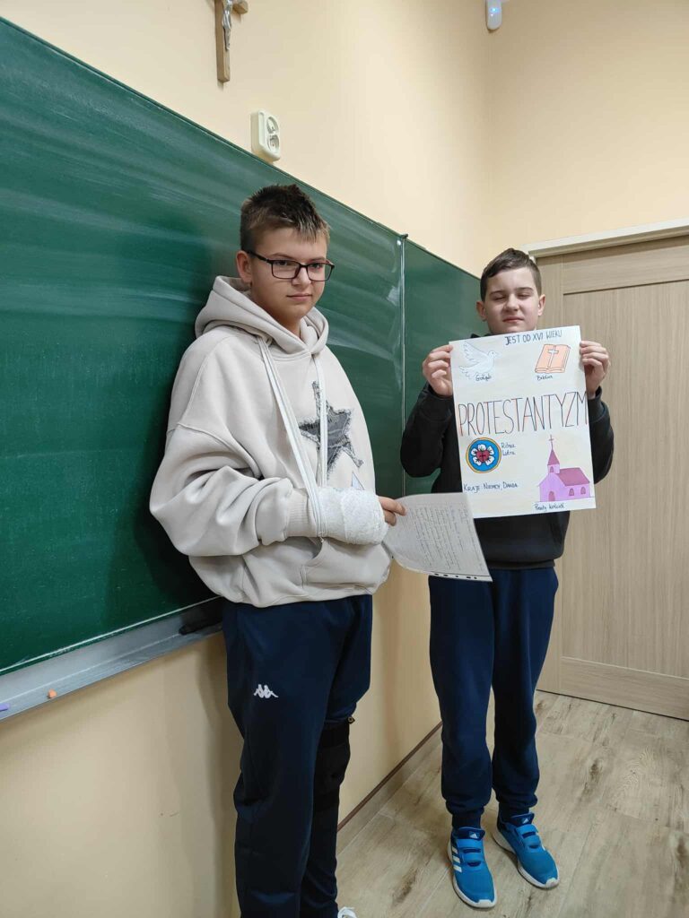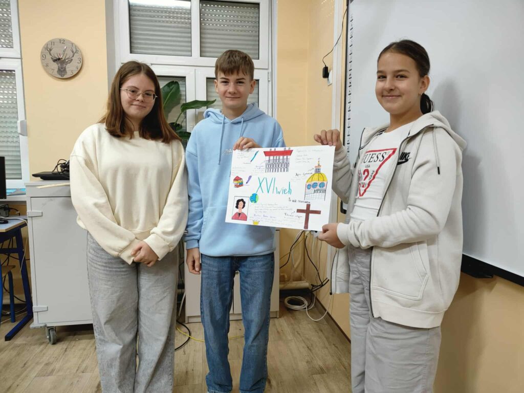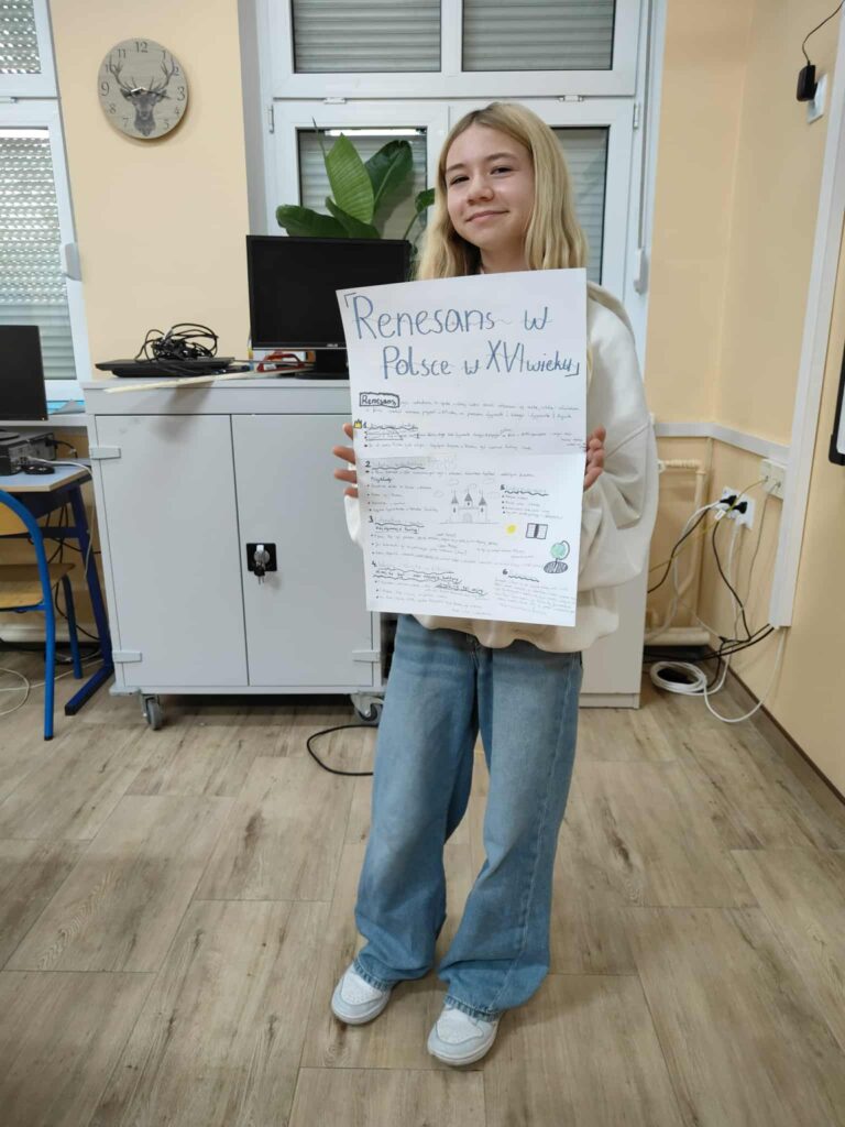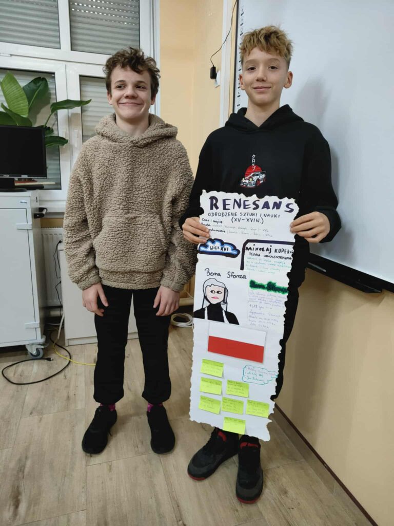 W bieżącym miesiącu uczniowie klasy VI realizowali wybrane zagadnienia dotyczące Renesansu w dawnej Rzeczpospolitej oraz różnych religii, które w tym czasie były wyznawane w naszym kraju pracując metodą projektu. Podczas zajęć uczniowie samodzielnie wyszukiwali informacje, analizowali źródła historyczne i opracowywali własne materiały – plakaty, przedstawiające życie i osiągnięcia ludzi epoki odrodzenia. Praca metodą projektu pozwoliła uczniom nie tylko pogłębić wiedzę o kulturze i nauce Renesansu, ale także rozwinąć umiejętności współpracy, planowania działań oraz twórczego rozwiązywania problemów. Efekty ich pracy zaprezentowano podczas lekcji podsumowującej, która była okazją do wymiany pomysłów i wspólnej dyskusji o znaczeniu Renesansu dla rozwoju naszego kraju.