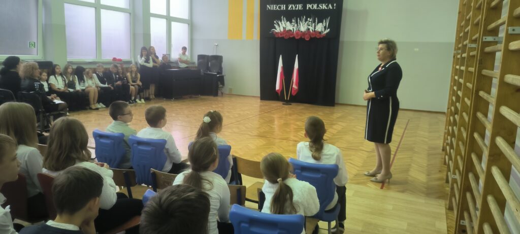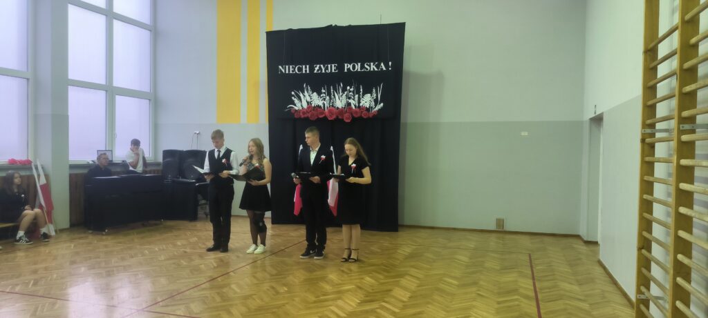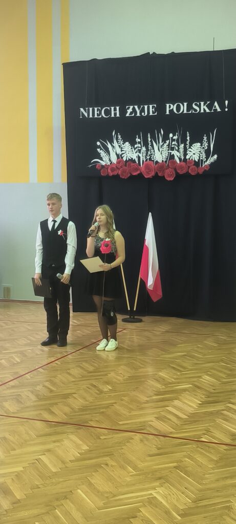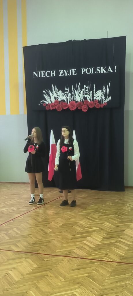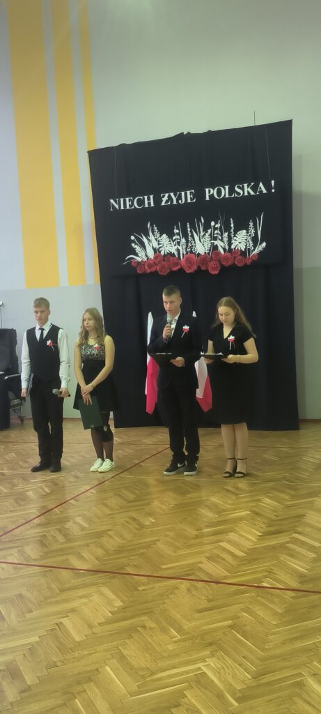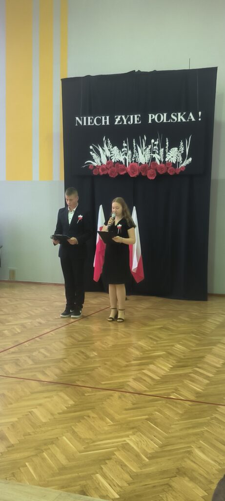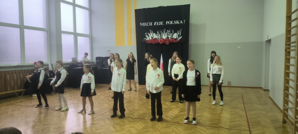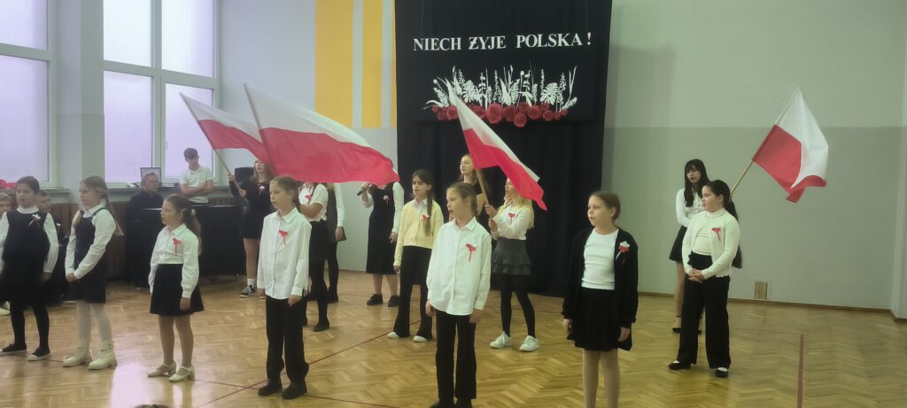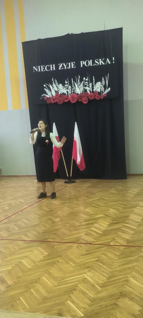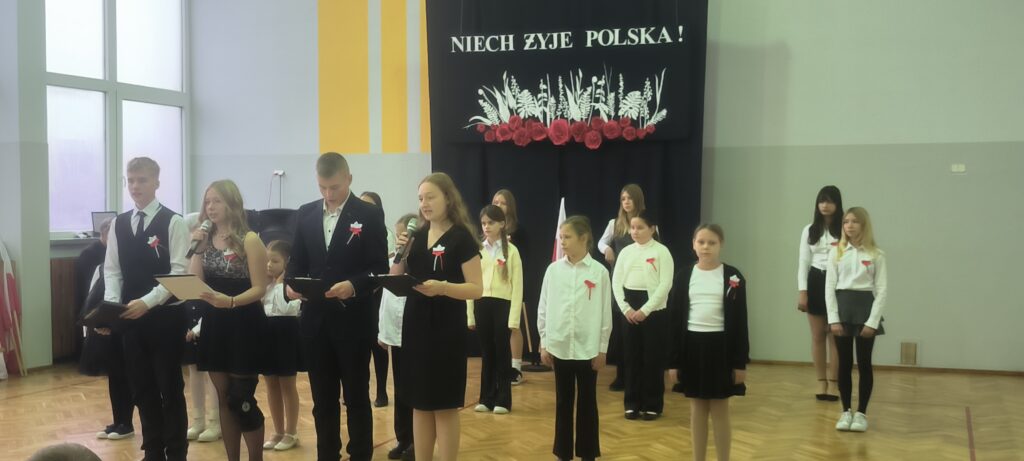 10 listopada 2025 roku w naszej szkole odbył się koncert patriotyczny pod hasłem: ,,Niech żyje Polska!”. W ten wyjątkowy sposób uczciliśmy 107. rocznicę odzyskania przez Polskę niepodległości. Za oprawę artystyczną wydarzenia odpowiadały panie Magdalena Wojciechowska i Marta Oczachowska. Na scenie wybrzmiały przepiękne patriotyczne pieśni: ,,Legiony – Marsz Pierwszej Brygady”, ,,Czerwone maki na Monte Cassino”, ,,Dla niepodległej szli”, ,,Obudź się Polsko ma” oraz tytułowa ,,Niech żyje Polska”. Pieśni przeplatane były komentarzami prowadzących, które dodatkowo wpływały na podniosły nastrój i podkreślały wagę wydarzenia.