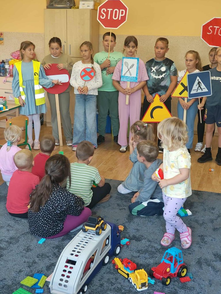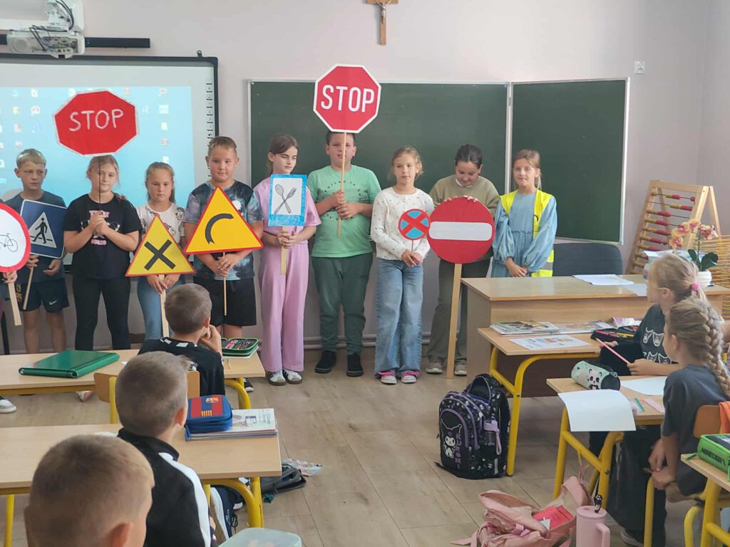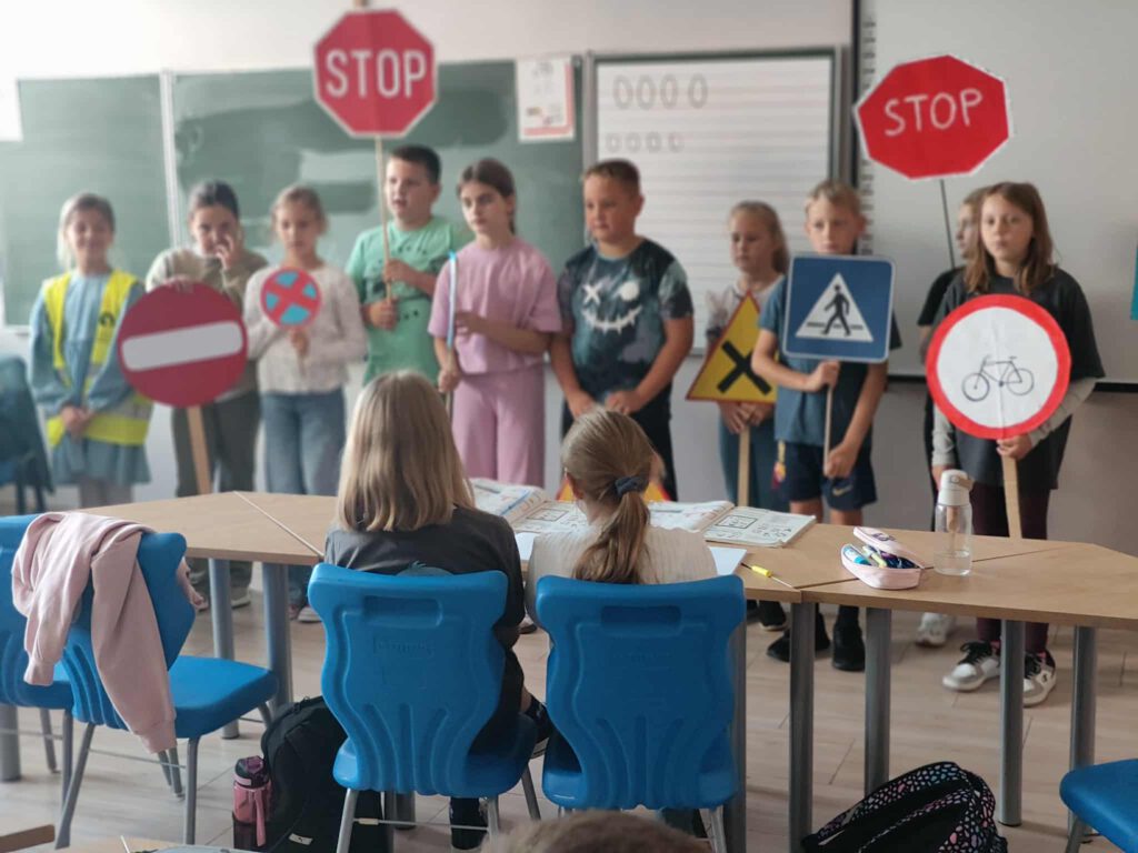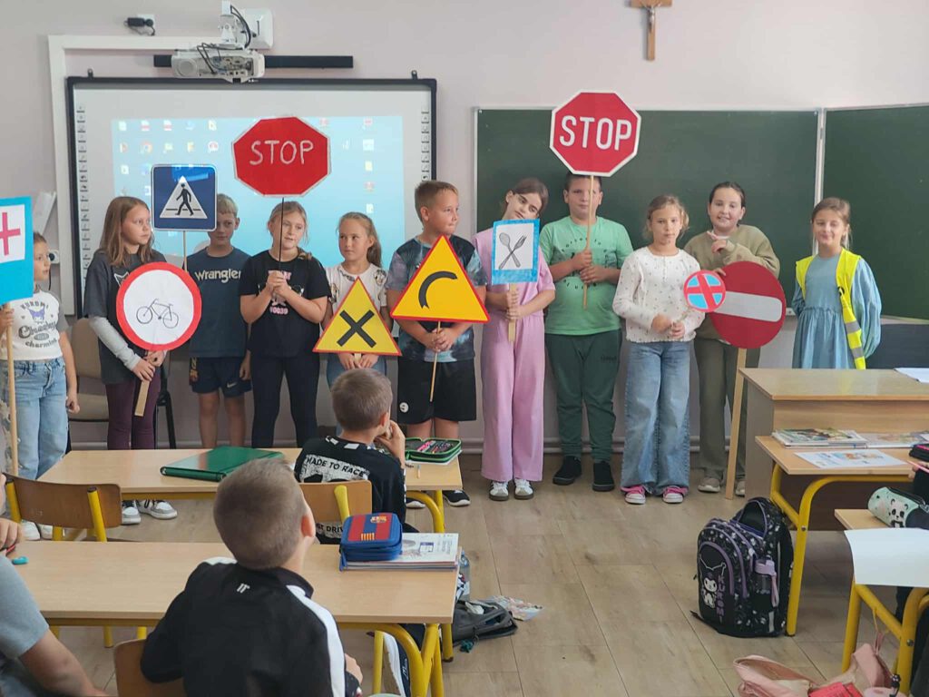 W zeszłym tygodniu dzieci z klasy 3 zaprezentowały młodszym kolegom krótkie przedstawienie o znakach drogowych. Celem przedstawienia było informowanie i edukowanie uczestników ruchu (pieszych) o przepisach, zakazach, ostrzeżeniach i zagrożeniach, aby zwiększyć bezpieczeństwo na drodze poprzez naukę właściwego zachowania i ułatwienie poruszania się w przestrzeni publicznej.
