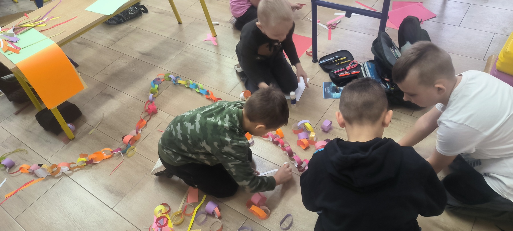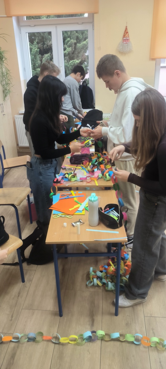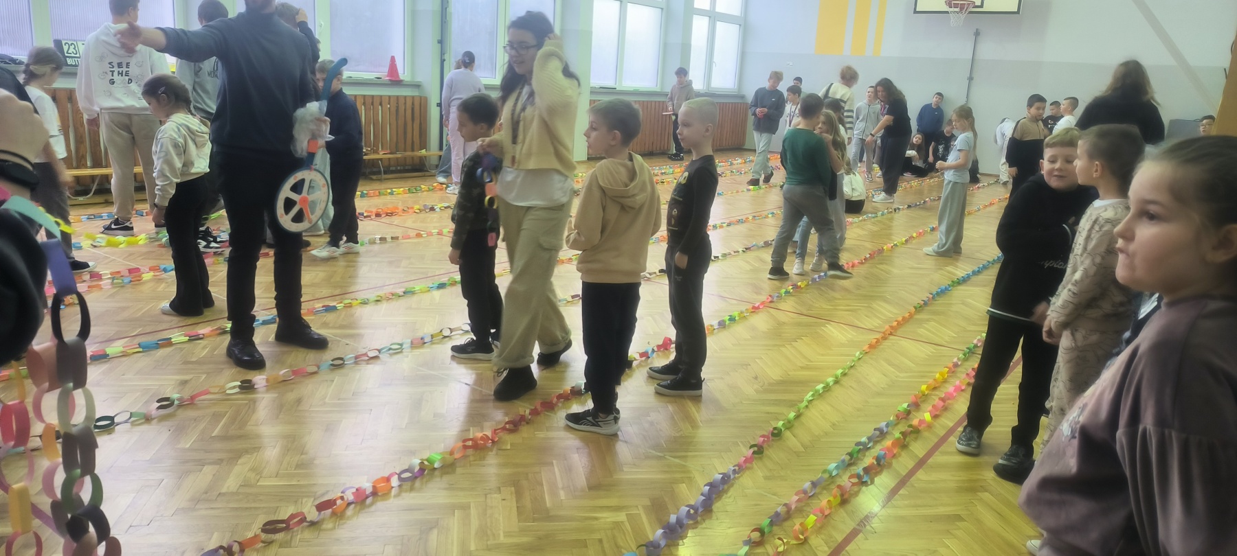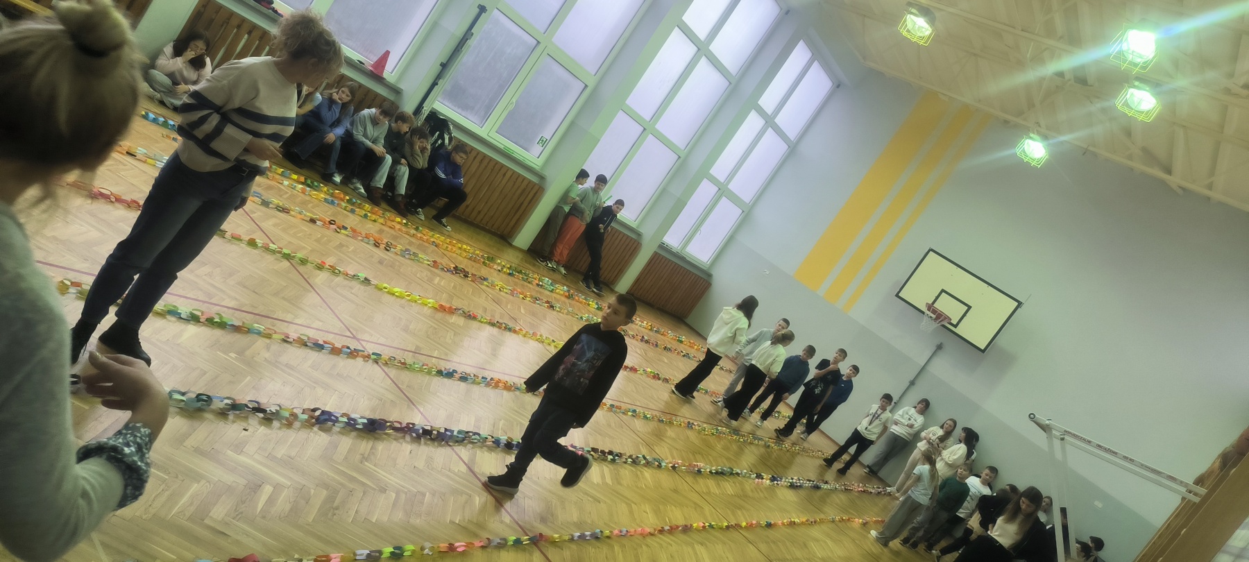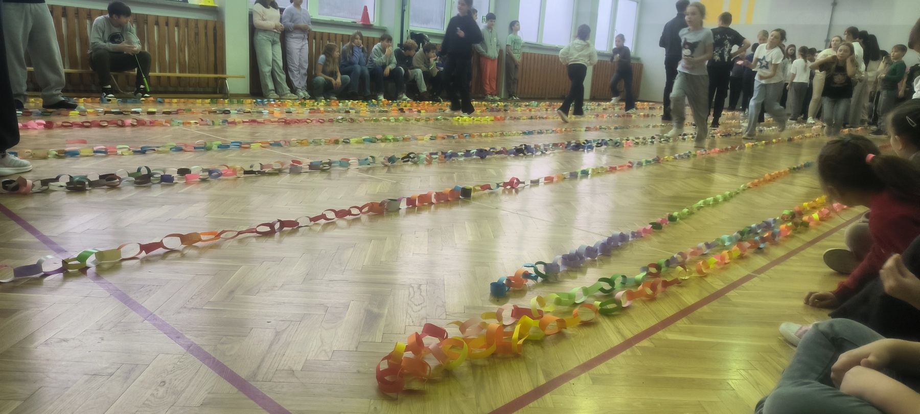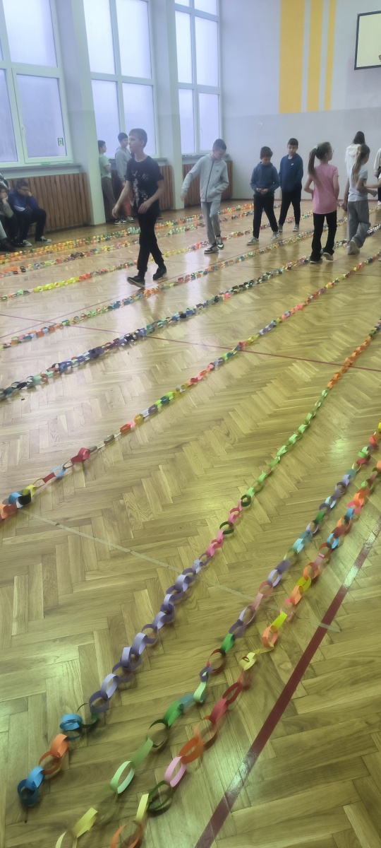 Po apelu wszyscy ruszyli do wspólnej pracy — klasy tworzyły długie, barwne łańcuchy z papieru. Efekty robiły ogromne wrażenie! Łańcuchy w piątek zawisły na szkolnych korytarzach i salach lekcyjnych. Długości wykonanych łańcuchów prezentują się następująco.